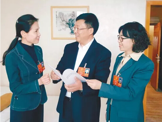 全國人大代表、沈鼓集團黨委書記、董事長戴繼雙(中)與其他沈陽籍人大代表交流撰寫議案建議。