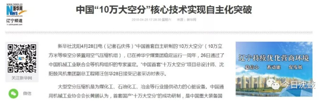 4月28日新華社報道了中國首臺套自主研制的十萬空分機組通過國家鑒定的相關(guān)消息——